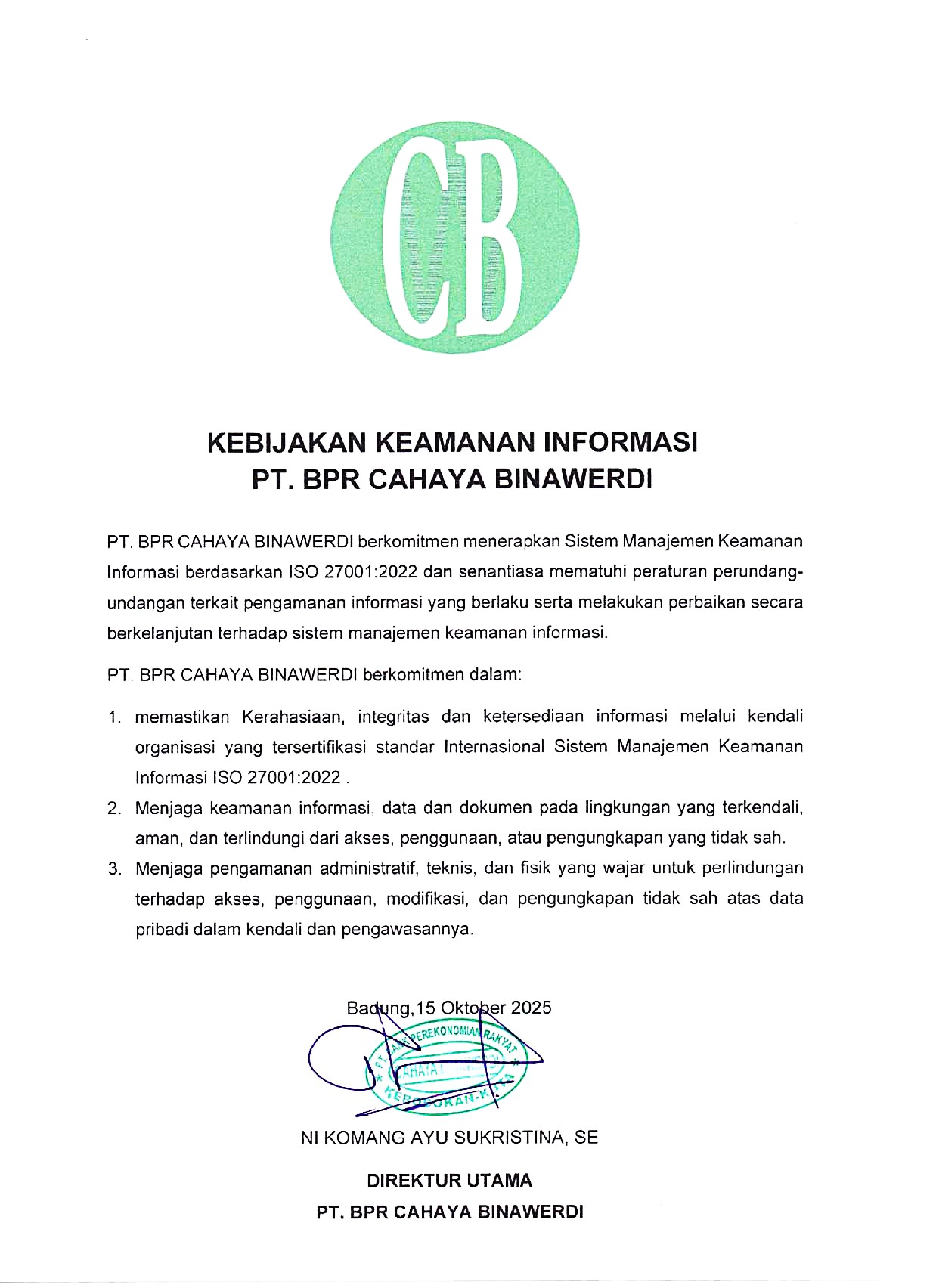 Pimpinan dan seluruh jajaran manajemen PT BPR Cahaya Binawerdi berkomitmen untuk menerapkan sistem manajemen keamanan informasi pada penyediaan layanan Jasa Pembayaran kepada nasabah / pelanggan, melalui: